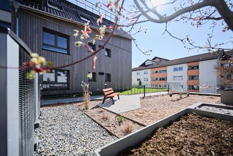 Ein zentrales Treppenhaus mit Aufzug verbindet die beiden Gebäudeteile. Direkt angrenzend lädt ein Kinderspielplatz zum Verweilen ein. Die liebevoll gestalteten Außenanlagen mit üppiger Begrünung fügen sich harmonisch in das Gesamtbild ein.