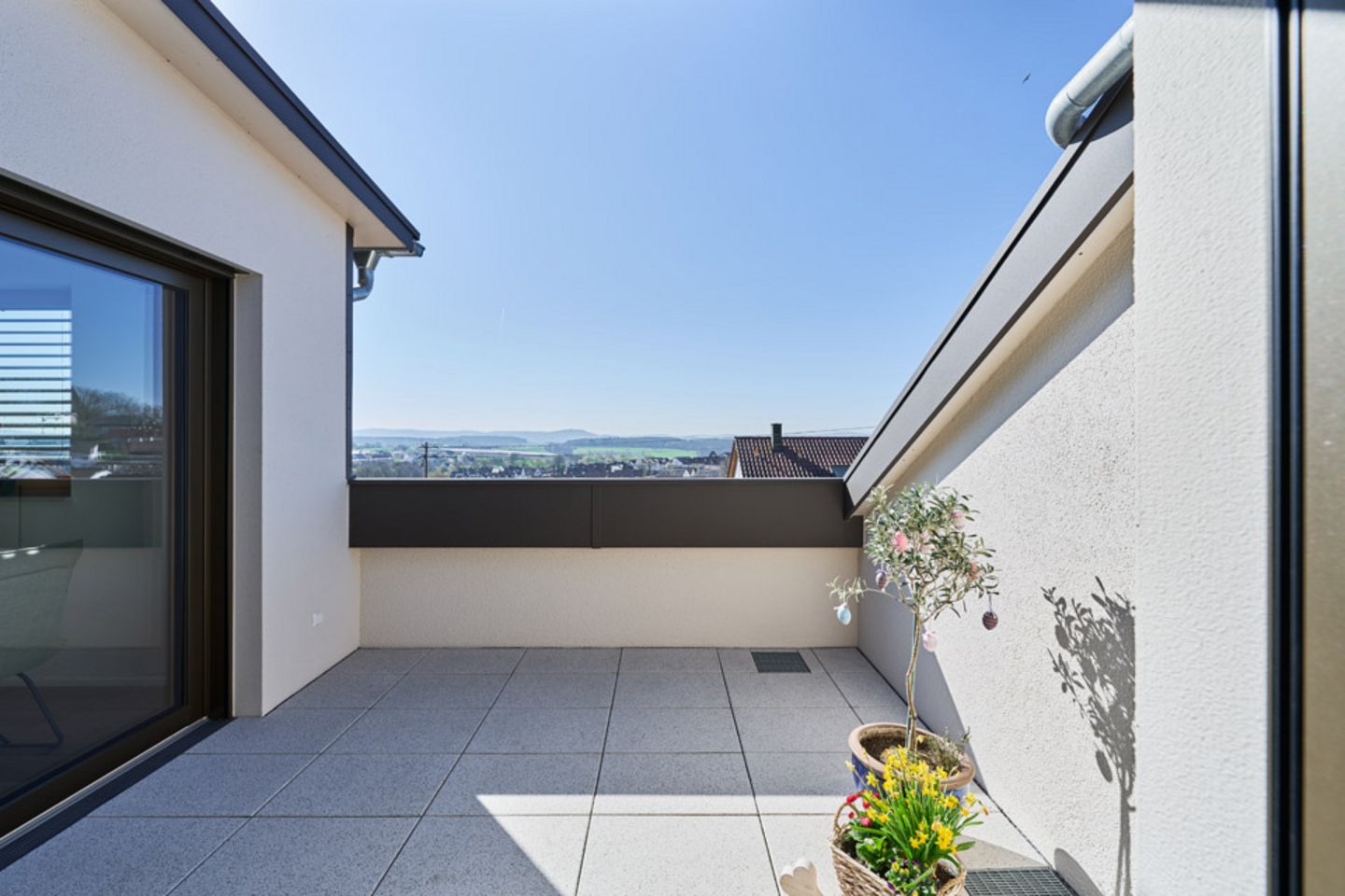 Das Dachgeschoss beherbergt eine exklusive 3,5-Zimmer-Wohnung mit 88 m2 Wohnfläche. Die offene Raumgestaltung, bodentiefe Fenster und die Dachloggia schaffen ein einzigartiges Raumgefühl mit hoher Wohnqualität – ideal für Paare, die einen Neuanfang im Alter suchen.
